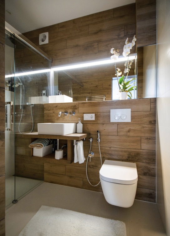 Формы и цвета сантехники подбирают, исходя из выбранного стиля дизайна. Если есть возможность, сантехнику делают навесной, закрепляя на стене – это зрительно облегчает интерьер и упрощает уборку.