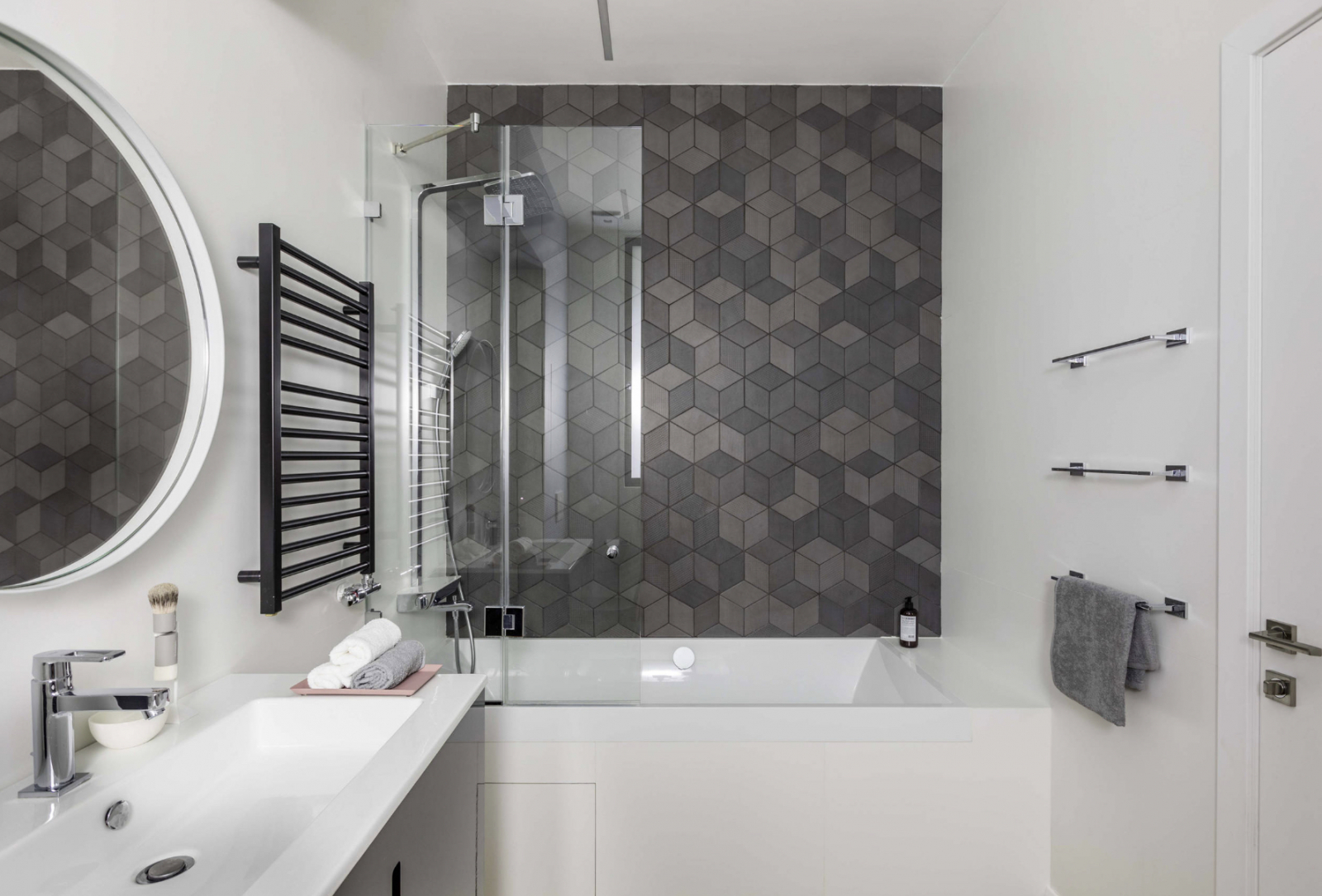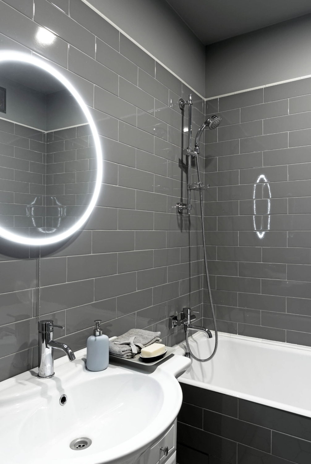 Избежать монотонности интерьера можно, выбирая серую плитку для ванной не только различных оттенков, но и разных фактур, а также размеров. Часть стен можно выложить крупными плитками кафеля, а часть покрыть мозаикой, или выложить мелкой плиткой другого тона.