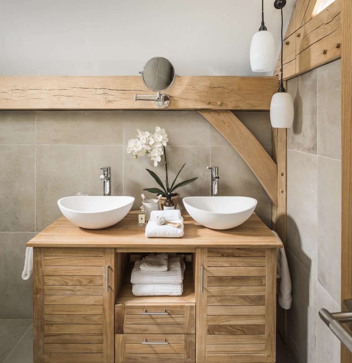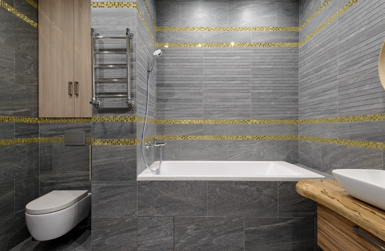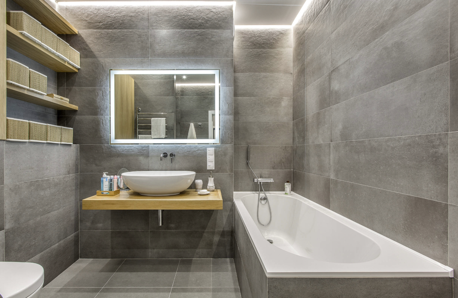 Серая плитка для ванной в сочетании с фактурой натурального дерева в мебели - типичный выбор дизайнеров при оформлении интерьеров в современных стилях. Чтобы сделать помещение более ярким и жизнерадостным можно использовать мебель в качестве акцентного элемента, выкрасив ее в активный цвет, например, алый, бирюзовый, желтый.
