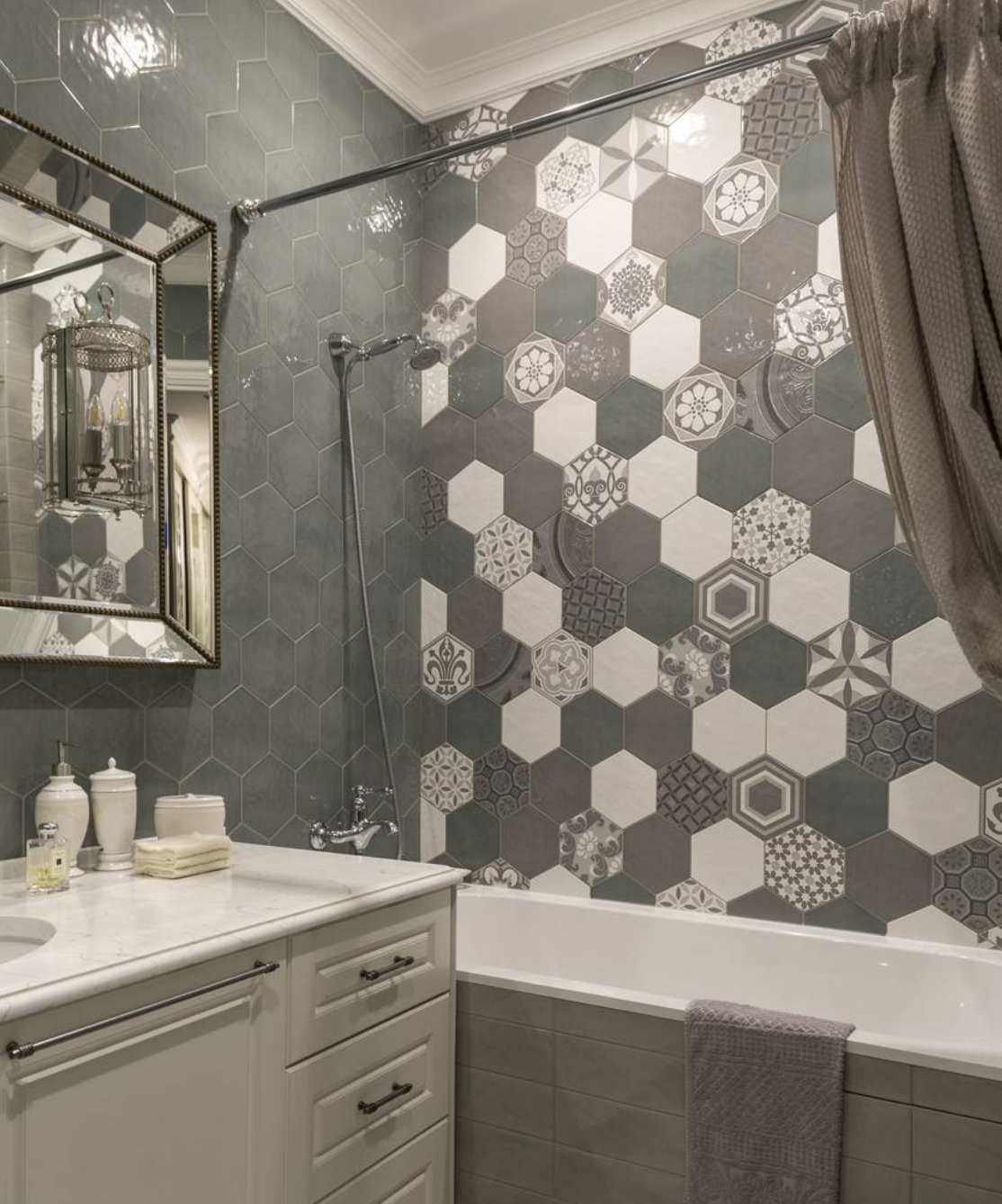 Эффектно сочетаются между собой плитки с разной поверхностью - глянцевой, матовой, “под бетон”, “под камень”, металлизированные плитки. Даже в том случае, если по цвету все они будут совпадать, интерьер не будет выглядеть скучно - игра фактур наполнит его внутренним содержанием. Разумеется, ничто не мешает сочетать серые плитки с цветными, или с окраской стен в разные тона. Особенно выигрышно смотрится сочетание с белым, а также с голубым и синим.